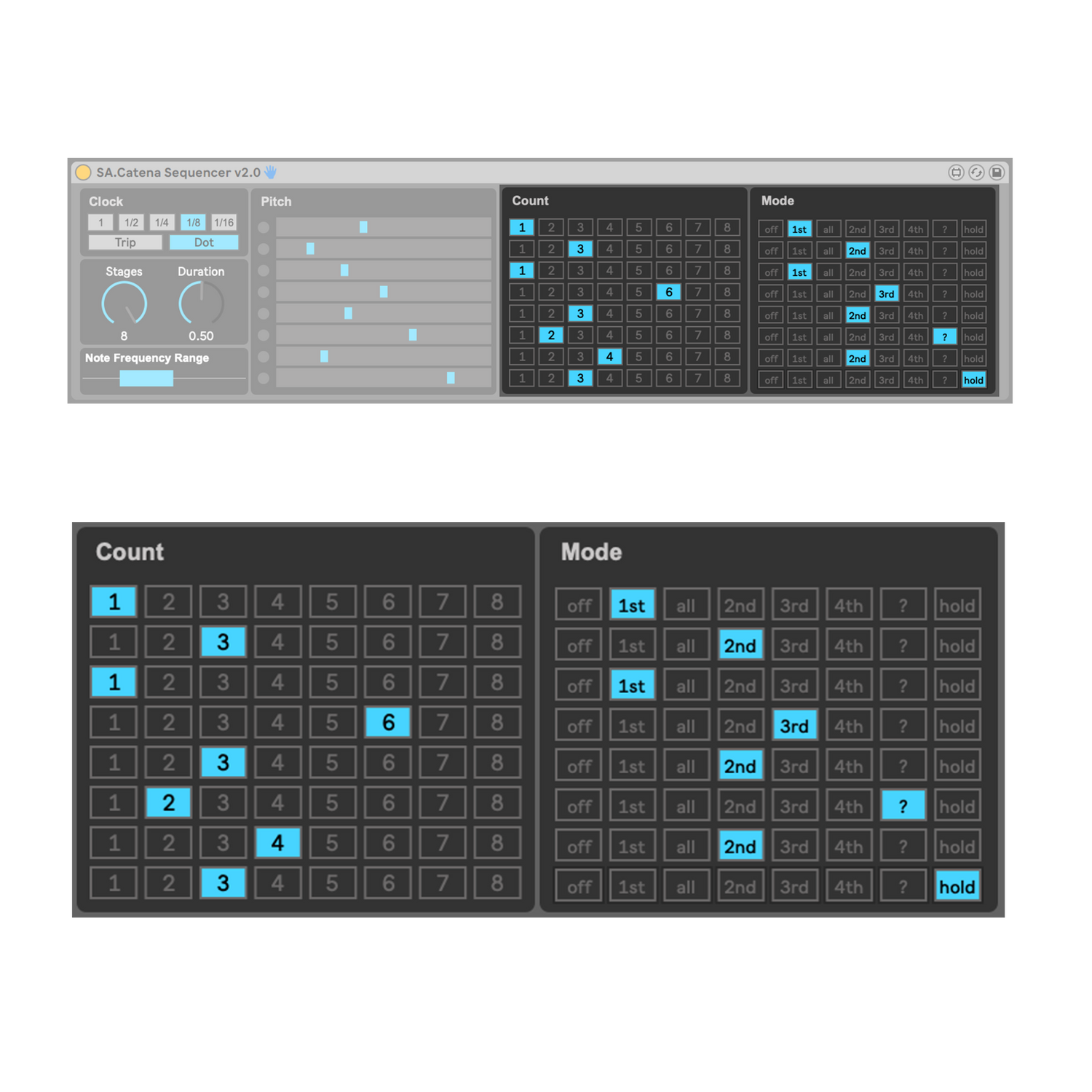 Use the Stages knob to adjust how many stages are active. The Duration knob controls how long each note is held.